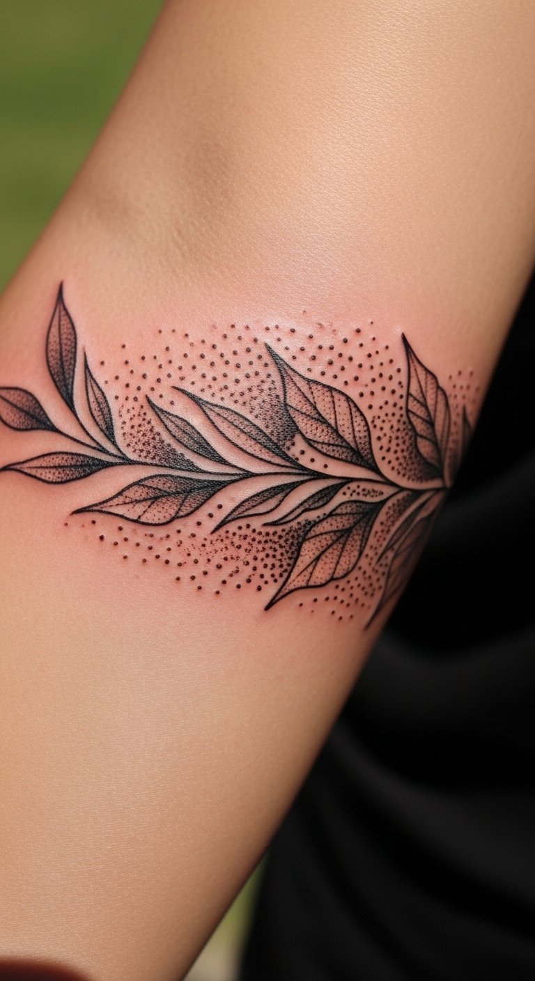 A botanical band uses stippling to create soft shadows and lifelike leaf textures without full graywash. On the forearm it sits where you can admire it daily and it's easy to hide with long sleeves. Pain is lower here thanks to decent flesh, and small sessions work fine. Dotwork really shines when you want dimension but not solid black fill. Healing shows early dullness while scabs fall—don’t over-moisturize or you’ll lose that stippled texture. Common mistake: asking for photorealistic leaves at micro scale; dotwork suggests texture rather than photo detail, so scale up key shapes and let stippling do the rest. Ask the artist for healed botanical examples rather than only fresh photos.