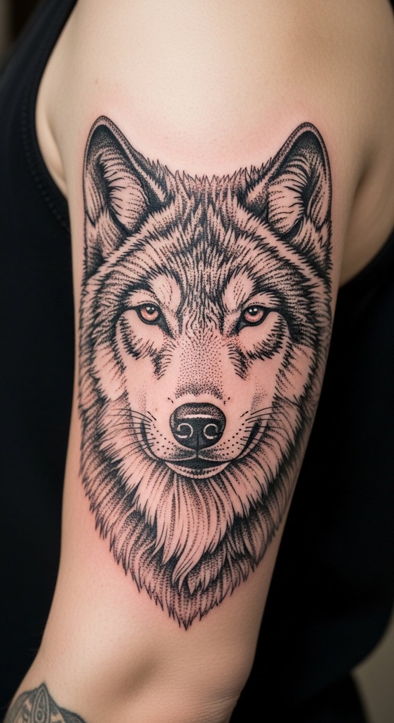 Dotwork portraits, like a wolf, are about texture. Instead of solid shading, thousands of dots build fur and depth. On the outer arm this reads bold from a distance but holds detail up close. Pain is manageable; longer sessions are needed for gradual saturation. In my experience, dotwork realism keeps contrast longer than graywash because there's less solid gray to fade flat. The common mistake is expecting photographic clarity; dotwork portraits read like textured illustrations, not photos. Ask for artists who combine stippling with subtle fine lines around eyes and snout—the hybrid approach maintains expression. During healing, avoid direct pressure and long sleeves that rub the piece.