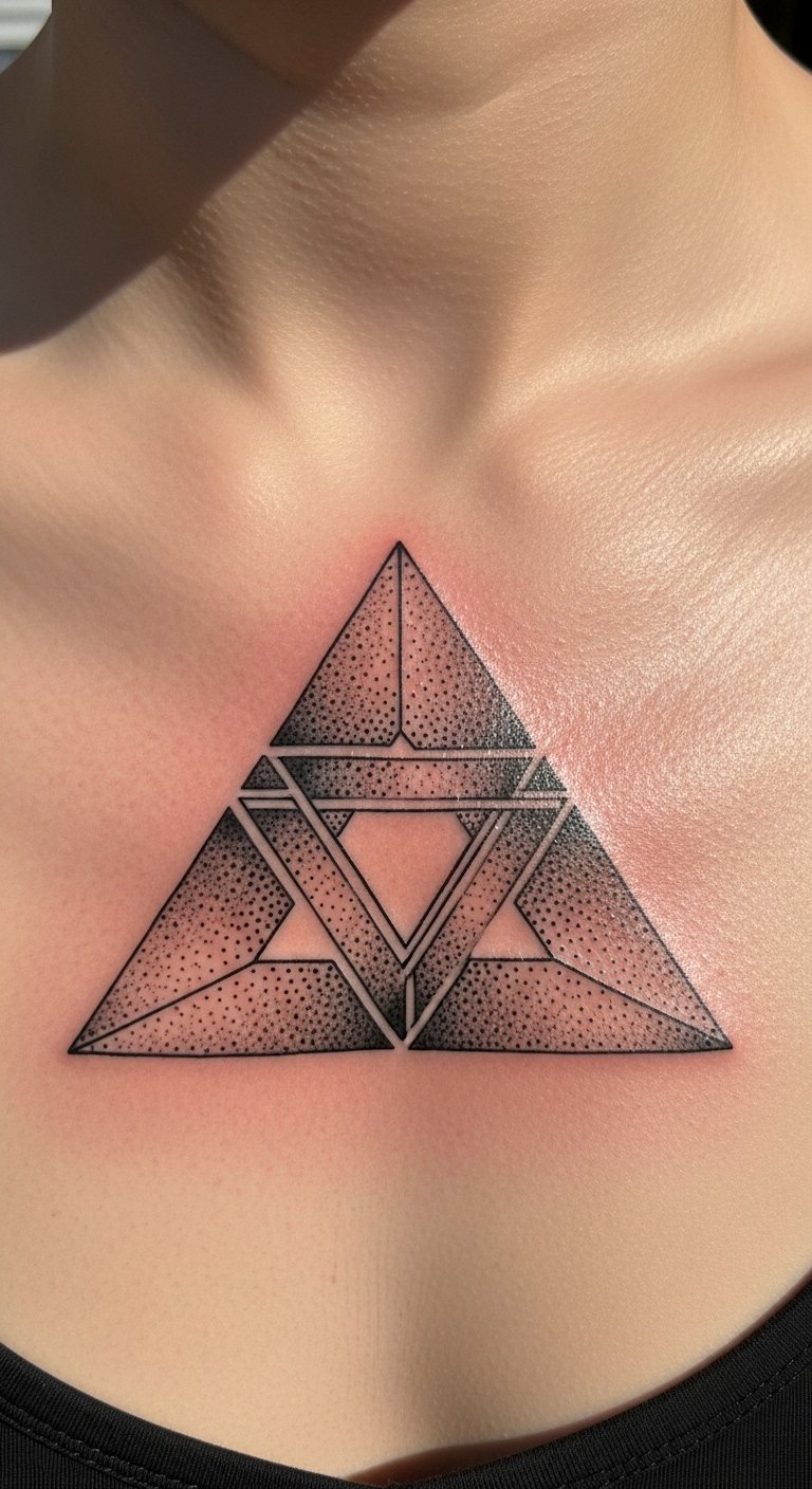 Triangles and interlocking shapes are hypnotic when stippled—density creates implied gradients and optical depth. Center-chest placement reads strong under clothing and works with collarbones. Pain varies: near the sternum is sharper, outer chest less so. Sessions can be done in one sitting if the piece is moderate size, but spacing ensures even saturation. Real-life aging: chest tattoos take sun well if you use SPF; otherwise the high-contrast blackwork can flatten with repeated sun exposure. Avoid overly tight dot patterns; leave breathing room between shapes. Ask to see healed chest geometrics so you know how dots settle across the sternum and ribs.