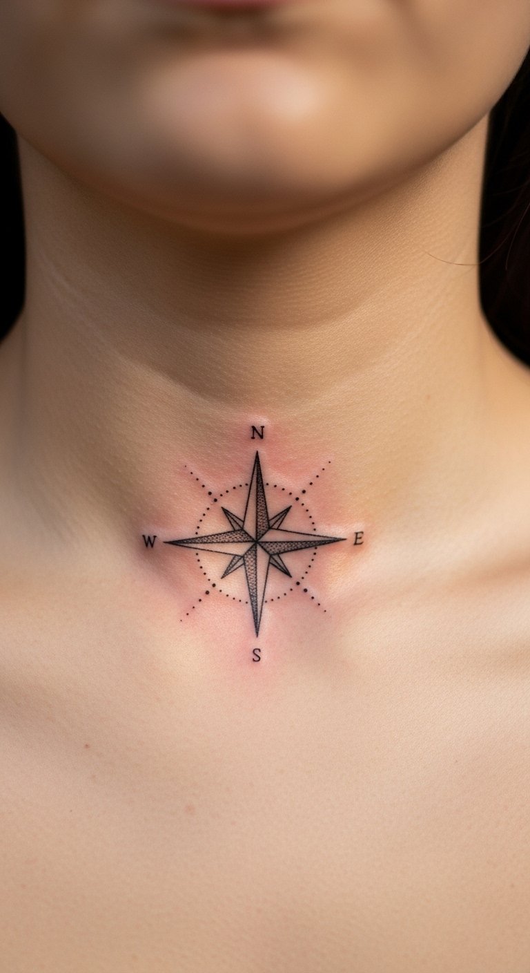 A compass in dotwork gives directional symbolism without heavy ink. Collarbone placement looks elegant but can be uncomfortable; the bone is shallow and the session stings more. The short sessions are doable—good for beginners who want statement placement without long sittings. Dotwork softens a bit after healing, so keep the directional points bold enough to read from a distance. Common mistake: tiny compass points that vanish into skin texture—ask your artist to slightly exaggerate main lines. Post-care should include sunscreen whenever collarbone is exposed to protect contrast.