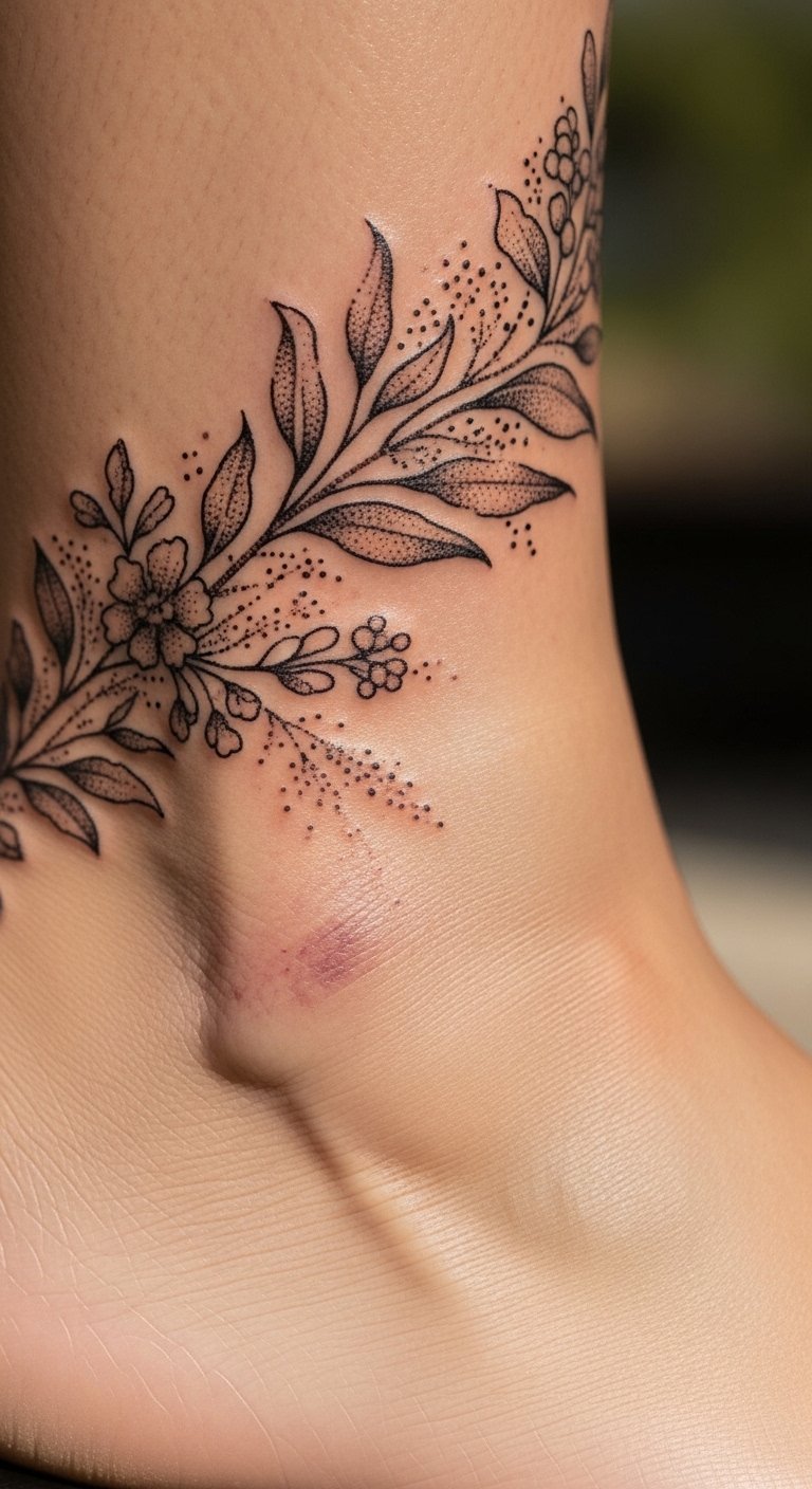 Ankle dotwork looks delicate but stings because bone is close to skin. A wrap design lets dots flow around the joint; when healed it reads like lace. Because ankles flex and move, expect scattered dot softness over time; heavier dots at key anchor points keep the design readable. Mistake to avoid: filling the entire wrap with micro-dots—balance negative space so the piece remains crisp. During healing, avoid tight socks and rigid shoes that rub the area. Ask artists for healed ankle wraps—they show how dots shift with movement and time.