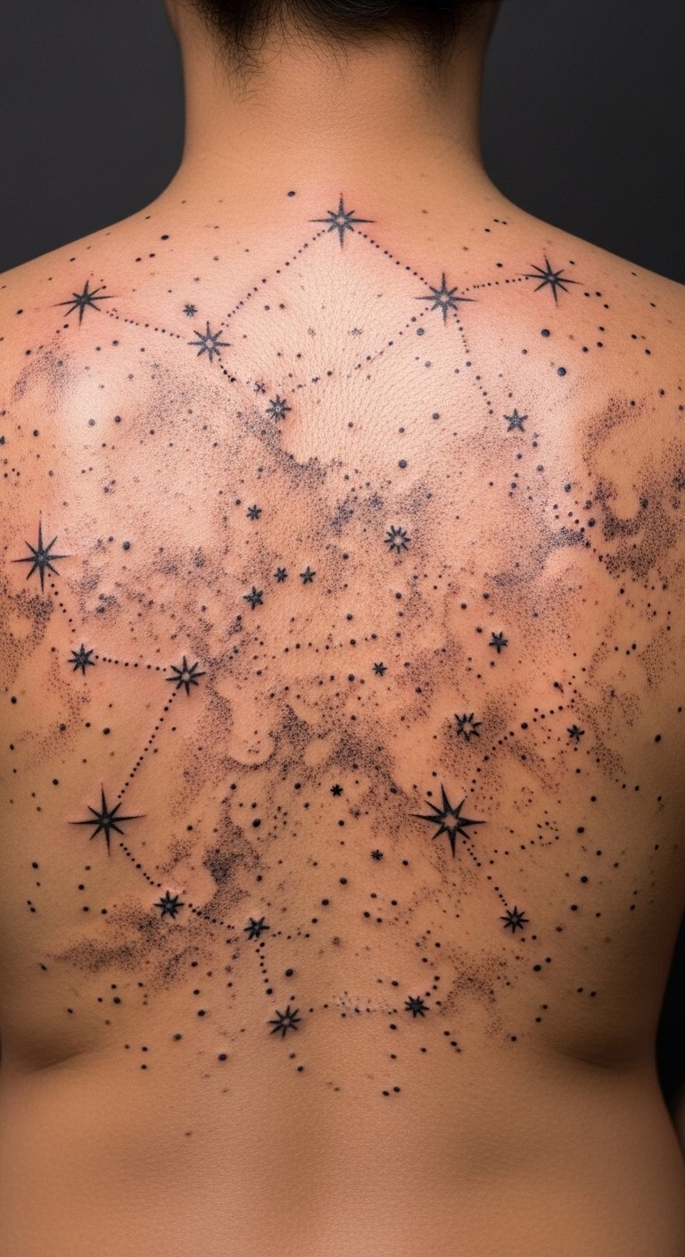 A scattered constellation piece across the back uses dot density to suggest nebulae and star clusters. The back is a generous surface, so you can play with scale and spacing. Pain ranges because the back has mixed zones—near scapula can be more sensitive. Sessions are usually shorter and staged so you can rest between dot-heavy passes. I like this design because it invites additions over time: new clusters, shading, or small constellations. A frequent mistake is over-detailing tiny stars; keep stars varied in size and let negative space mimic distance. Ask for healed back constellations to see how the lighter stippling looks after one year.