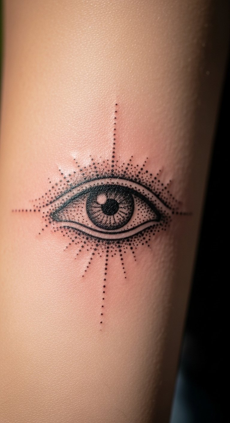 A sacred eye in dotwork feels meditative—dots around the iris and lashline create a smoky halo without heavy black fill. The inner forearm is an ideal canvas: low-to-moderate pain and easy to show or cover. Healing is straightforward; watch for stretched skin if you work out frequently. Beware of asking for too many micro details—opt for bold contrasts to keep the symbol readable. Look for artists who pair dotwork with delicate linework around features to maintain clarity. This placement is great if you want a daily reminder motif that ages predictably.
