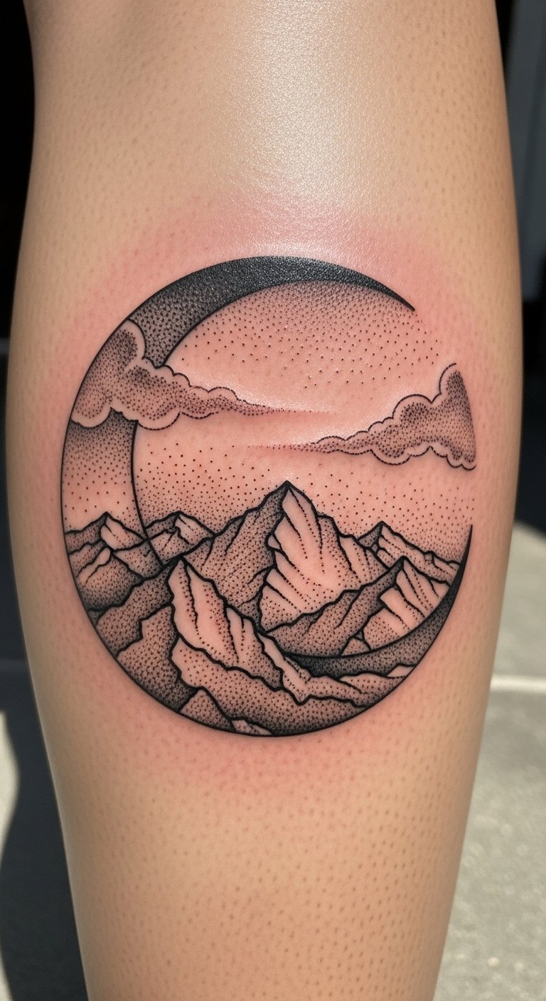 Dotwork Crescent Landscape on Calf