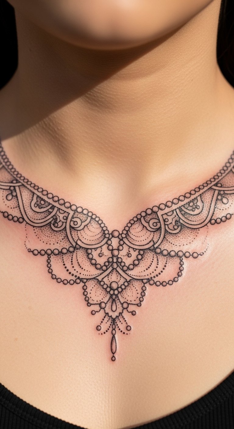 A collar necklace tattoo frames the neckline with repeating dot elements and small negative-space chains. It reads like jewelry but is permanent, so spacing and symmetry are critical. Expect light-moderate discomfort over the upper chest and near clavicles. The design ages well if dots are sized for long-term visibility—tiny beads tend to blur over time. Artists who use stencil placements and photographs of healed collar pieces are worth seeking out. During healing, avoid heavy necklaces that could tug at scabs and delay proper settling.