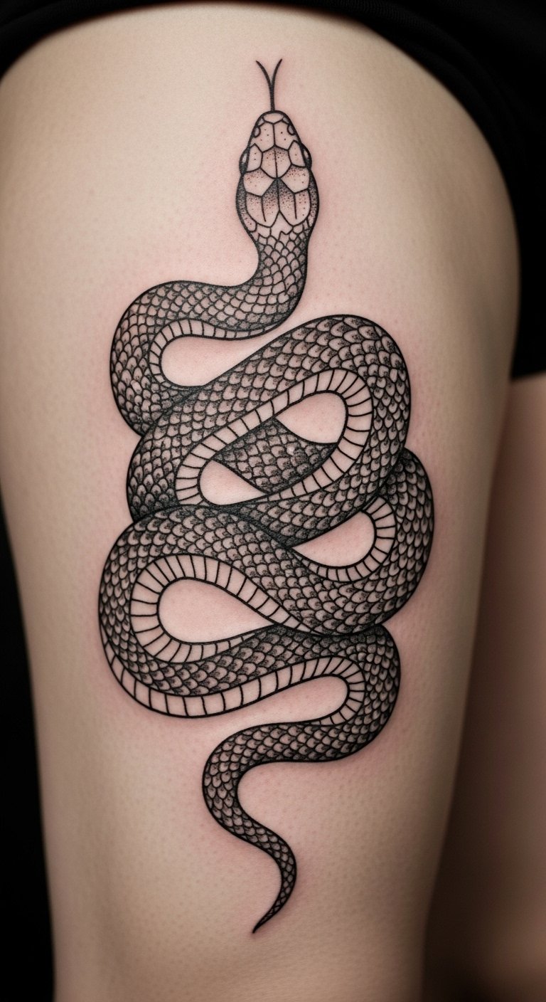 Dotwork Snake Coiling on Thigh