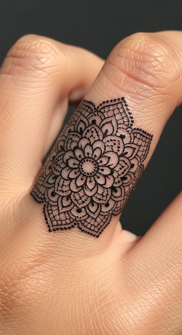 Finger tattoos are small but painful and prone to faster fading because of constant use. A mandala-style ring in dotwork looks delicate but requires bold dot anchors to survive wear. Expect touch-ups: fingers live a rough life. My advice is to accept that the ring may need refreshes; avoid hairline dots only. Also avoid overly tight stippling that blends into a gray smudge. Ask the artist about their finger-healed portfolio and follow strict aftercare—no heavy hand washing for the first week helps.