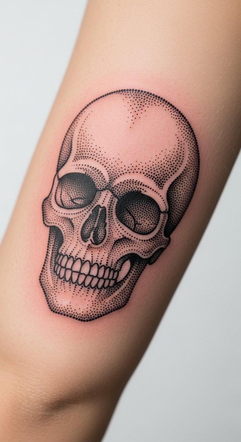 Elbow-adjacent pieces are notorious for pain and tricky healing because of constant movement. A skull rendered in dotwork around the elbow can wrap and read from multiple angles if scaled properly. Expect strong discomfort and potential for longer healing due to stretching. Dotwork survives here only if the artist plans heavier anchor dots and leaves breathing space. Common mistake: trying to cram small details onto a moving surface. Bring photos of how you use your arm during the consultation and request healed elbow examples from the artist.