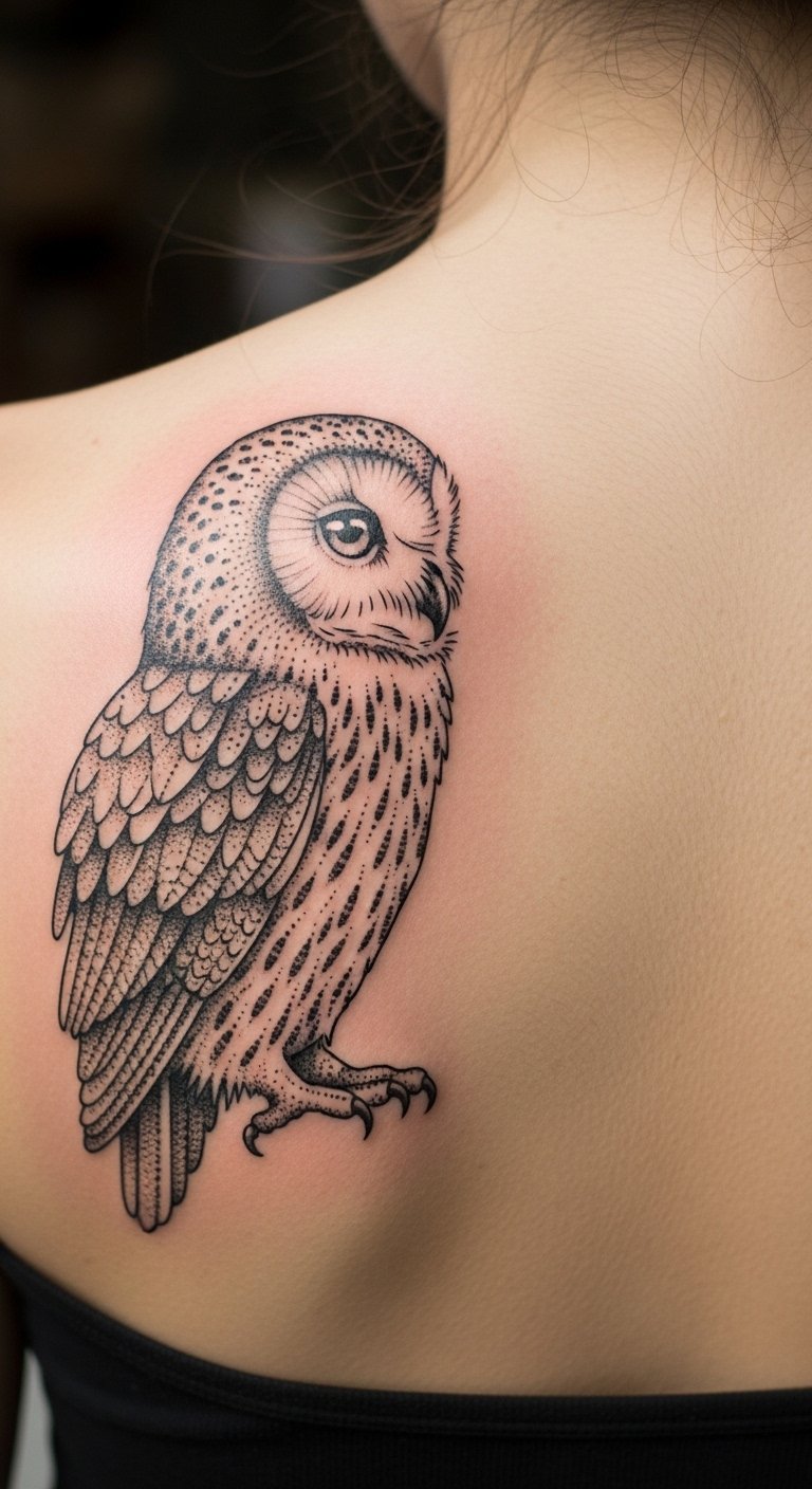 The shoulder blade is an artist-friendly surface: flat, noticeable, and low-pain. An owl in dotwork benefits from feather texture made with stippling and negative space for eyes. The area is easy to keep out of the sun and heals reliably. I often tell people this is a forgiving spot for first-time larger dotwork pieces. Avoid overfilling the wing detail—let the dots and voids suggest feathers rather than attempting photo realism. Ask to see healed shoulder blade birdwork so you can judge feather texture longevity.
