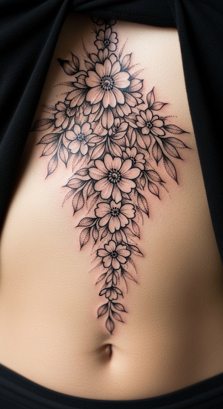 Dotwork Floral Sternum-to-Rib Cascade
