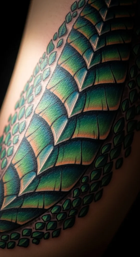 Dragon-scale tattoos work well for people who want subtle detail without a full dragon design. You can place them on the forearm, shoulder, calf, or thigh. These patterns use repetition, which helps keep costs predictable. Ask for honeycomb-style spacing so the scales sit naturally. If you want a quick appointment, stick to black linework without full shading. A handy DIY idea: cut small diamond shapes from paper and layer them on your skin to visualize placement. This look pairs well with other tattoos if you ever expand your collection. Make sure your artist varies scale size lightly for a natural feel.