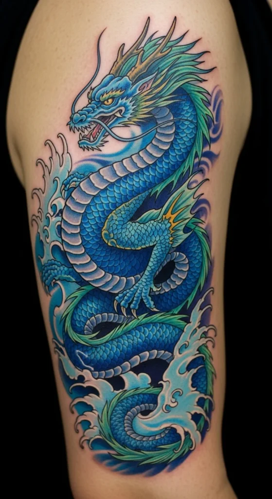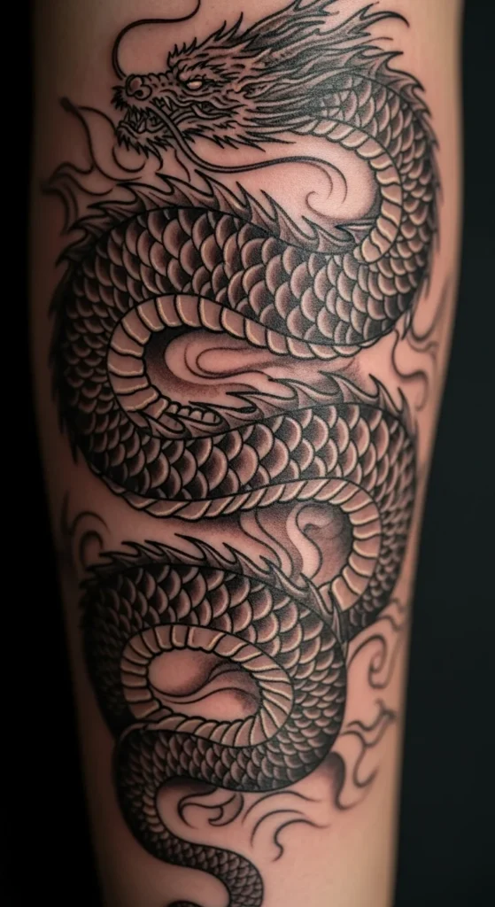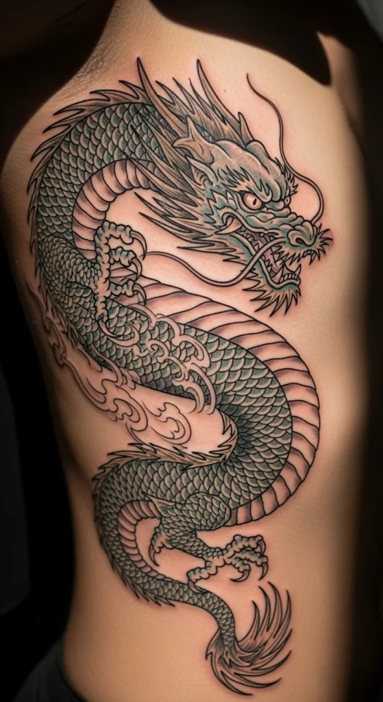 Water dragons symbolize calm movement and adaptability. Their curves blend perfectly with wave shapes. You can place this on the side ribs, arm, or back. If you want to save on pricing, keep the waves simple and skip detailed foam patterns. A good DIY strategy is studying wave drawings from Japanese art books—they help you see how water should curve. Use light shading for a smoother look. This design works nicely for people who want something expressive without flames or aggressive poses. Ask your artist for soft transitions so the dragon looks like it’s gliding.