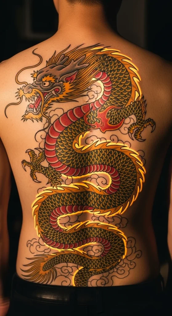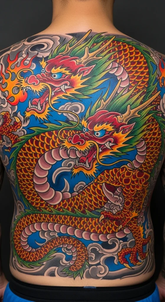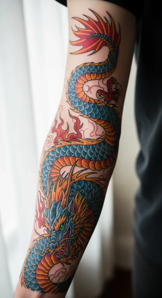 Neo-traditional dragons use bold outlines, bright hues, and cartoon-like structure. The mix gives a lively feel without losing the classic message of strength. To manage cost, choose a limited color palette—two main tones and one accent. This keeps session time under control. Before heading to the studio, print a few color wheels and mark the tones you prefer. Bring these to help the artist understand your choices. This style shines on the arm, thigh, or calf. If you want more dimension, ask for soft halos or glow effects instead of heavy backgrounds.