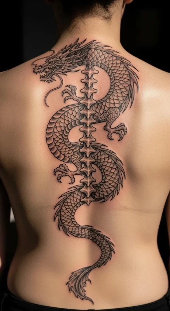 A spine dragon looks graceful and symbolic. The vertical line of the backbone creates a natural path for the body. Keep the dragon thin so it aligns smoothly with your posture. If you want to avoid higher bills, skip complex wings or large clouds. Simple curves and light shading work beautifully here. Have a friend help you mark the center of your back with tape to visualize placement. Bring this guide to your artist. The spine can be sensitive, so ask for shorter sessions. A vertical design like this often ages well because it avoids heavy color loads.