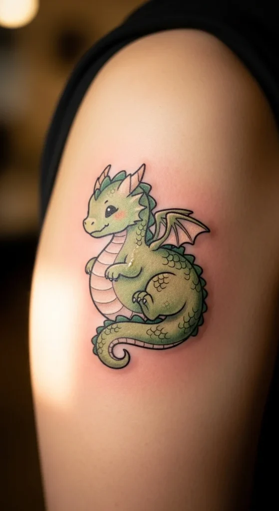 Baby dragons bring a playful mood to your ink. They sit nicely on the ankle, wrist, or shoulder blade. The round shapes make the tattoo easier and quicker for artists. If you’re watching your budget, this is one of the friendliest choices. Use simple outlines with a bit of soft shading under the belly or wings. A fun DIY idea is sketching baby dragons using cartoon references. Keep eyes large and bodies small. Your artist can then refine it into a clean tattoo. Many people choose these designs to mark personal growth or a lighter chapter in their life.