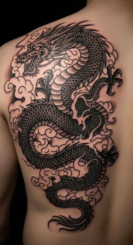 Traditional cloud dragons rely on bold lines and expressive forms. This combo looks strong on arms, backs, and chests. The clouds help fill space without raising cost dramatically. Ask for rounded cloud edges to soften the intensity. If you want a lower-price session, keep everything in black and grey. A practical DIY step: print cloud patterns and test how they frame the dragon. The design expands easily if you ever want to add flowers or waves. This style gives your tattoo a timeless look.