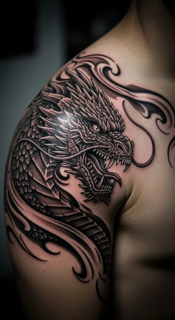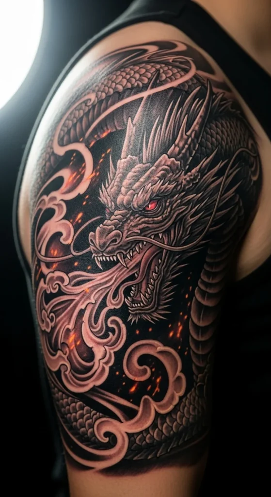 A shoulder dragon head uses the round shape of your deltoid to create a bold look. The natural curve makes the eyes and snout pop. This is a good pick for anyone who wants something expressive but not overly large. Bring your artist reference angles—from above, below, or side view—so the head matches your body shape. If you want to keep costs down, skip the full body and focus on detailed face work. Adding clouds or smoke helps frame the piece without needing complicated extras. Keep the edges soft so it blends smoothly into your arm or chest. You can later expand the tattoo to a half-sleeve if you feel like it. This placement heals quickly, making it a low-stress option.