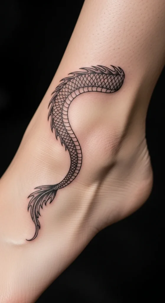 A dragon tail alone creates a subtle, stylish accent. It works on ankles, wrists, or behind the ear. Keep the lines thin and flowing. If you want to save time and money, skip scale details and use a simple curved line. Try drawing a swirl on your skin with washable marker to test how it looks. Many people pair this with a small flame or smoke twist at the end. This design is ideal if you want quiet symbolism without going large.