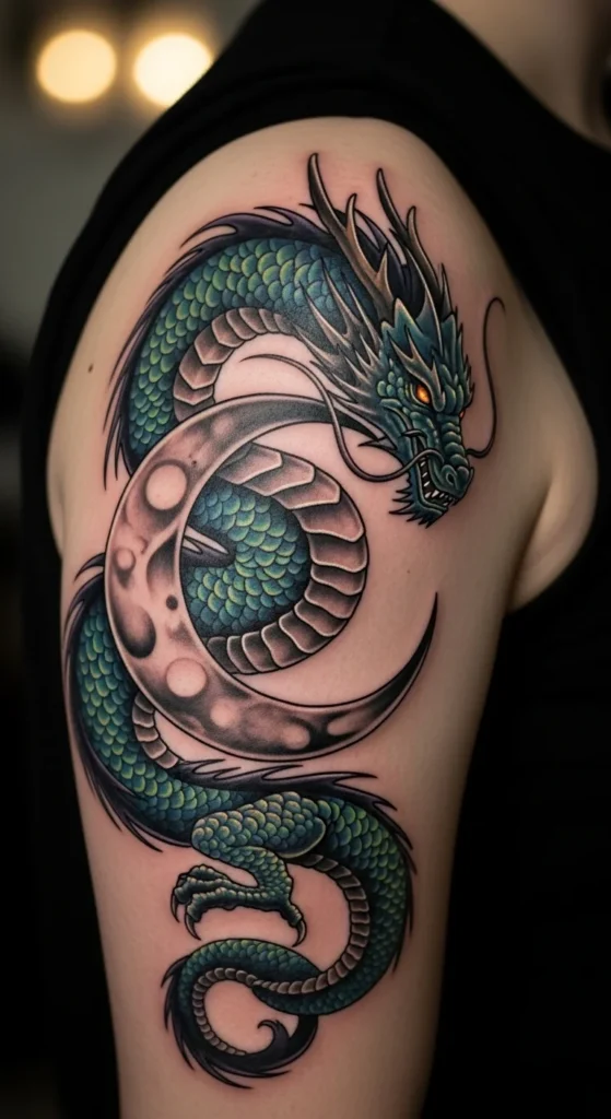 Pairing a dragon with a moon gives the tattoo a quiet, night-inspired vibe. It works well on the upper arm, back, or side ribs. For a budget-friendly pick, keep the moon as a simple outline. Add tiny stars if you like, but avoid heavy fills. A DIY idea: draw a half-moon on paper and place the dragon shape around it to test flow. Ask your artist for soft shading on the moon to make the dragon stand out.