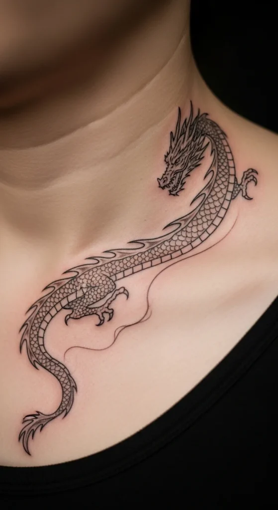 A collarbone dragon feels delicate yet expressive. The long curve of the bone naturally fits a slender body shape. Keep the lines light to maintain comfort during sessions. If you want to save on cost, use a single-line style. To plan placement at home, trace your collarbone with a washable marker and sketch the dragon curve above it. This tattoo heals quickly and looks striking under simple clothing.