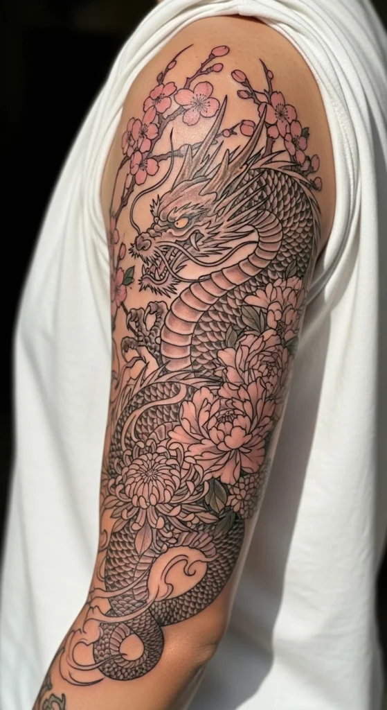 This sleeve pairs strength with softness. Choose flowers like peonies, chrysanthemums, or lilies to mix tones. If you want to keep the budget low, shade the dragon and outline the flowers only. Add color to petals later if you want more drama. Try placing printed flowers around a sketched dragon to test shapes at home. This combination makes the sleeve interesting without being overwhelming.