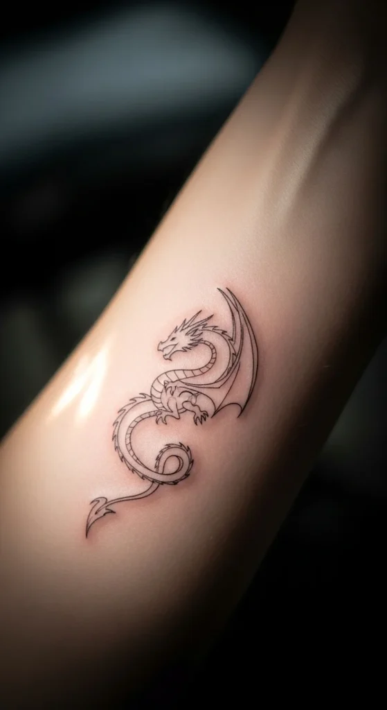 Minimal dragon tattoos are great for beginners. They use clean lines, light pressure, and tiny details that sit gently on the skin. These pieces look good on ankles, wrists, or collarbones. If your budget is tight, this style is perfect because it’s quick to complete. Try tracing a dragon shape using a pencil at home; simplify curves until you get a smooth outline. Bring this to your artist to keep things aligned with your taste. Ask for slightly thicker lines at curve points so the tattoo ages well over time. If you want depth without shading, try a double-outline technique that still feels light. Placement helps shape the mood—horizontal placements feel calm, vertical placements feel strong.