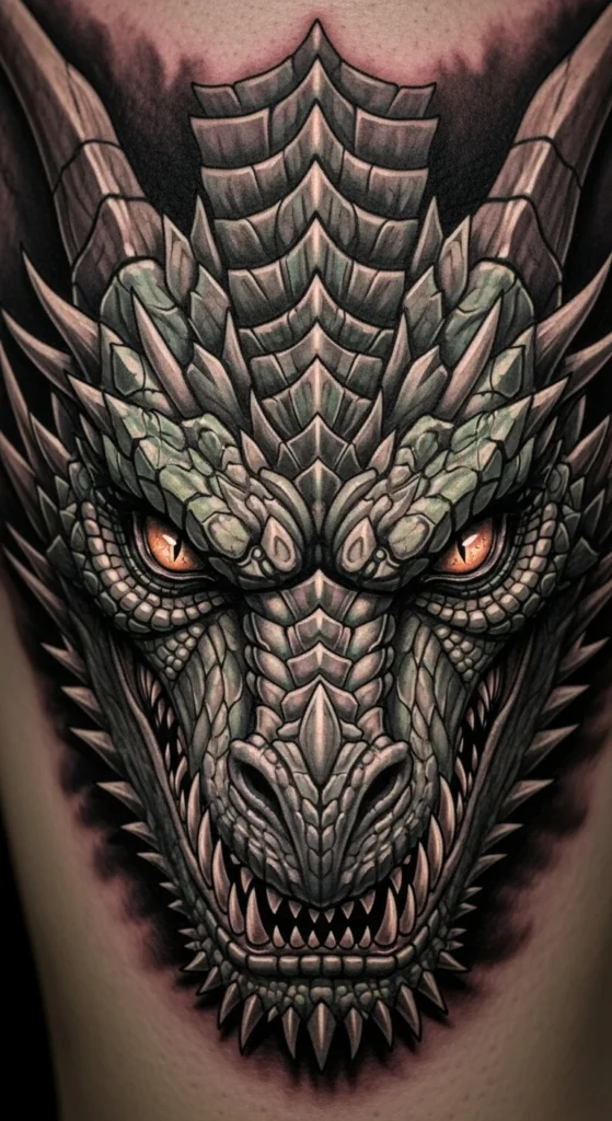 A realistic dragon head works when you want something bold without committing to a massive tattoo. You can fit it on the shoulder, thigh, calf, or upper back. Spend time with your artist choosing the angle—front-facing looks fierce, while a side profile feels more thoughtful. This style uses shading heavily, so ask for a session plan if you prefer short appointments. If you want to save money, skip color and focus on textures instead. Bring photos of reptiles, cracked stone, or wildlife for scale references. These help your artist build a believable head shape. Add subtle smoke wisps or small flames to frame the face without overwhelming it. Many people like the head-only style because it leaves room to expand later if you ever want a full body added.