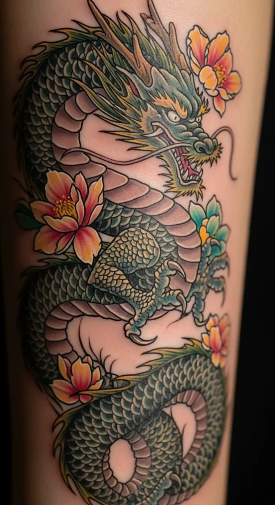 Pairing a dragon with flowers creates a mix of strength and softness. It works well on the thigh, upper arm, or side ribs. Pick flowers based on personal meaning—lotus for growth, chrysanthemum for resilience, or peony for confidence. If you’re on a budget, stick with black outlines for both elements and fill just a few petals with color. A simple DIY idea: print flower outlines and place them near your dragon sketch to visualize flow. Make sure the petals face outward to frame the body in a natural shape. Gentle shading gives depth without increasing time too much. Talk with your artist about symmetry; you don’t need perfect balance, but you should avoid crowding one side. This design is ideal for people who want a softer look while keeping strong symbolism.