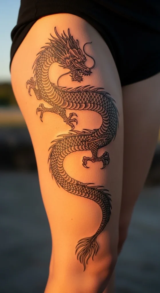 A thigh dragon gives you personal space to show detail without needing constant visibility. This area works great if you prefer larger tattoos but want to keep them private. The broad canvas allows smooth curves and long bodies. For a wallet-friendly approach, start with linework only. Add shading or waves later when you have extra budget. A practical trick is taping printed dragon outlines to your thigh to check placement. Ask your artist to angle the head near the hip or knee depending on the mood you prefer. The thigh’s softer skin helps with comfort during sessions. This design also lets you experiment with color if you want something bright. Many choose blues and greys for calm symbolism, but black and grey remain timeless.