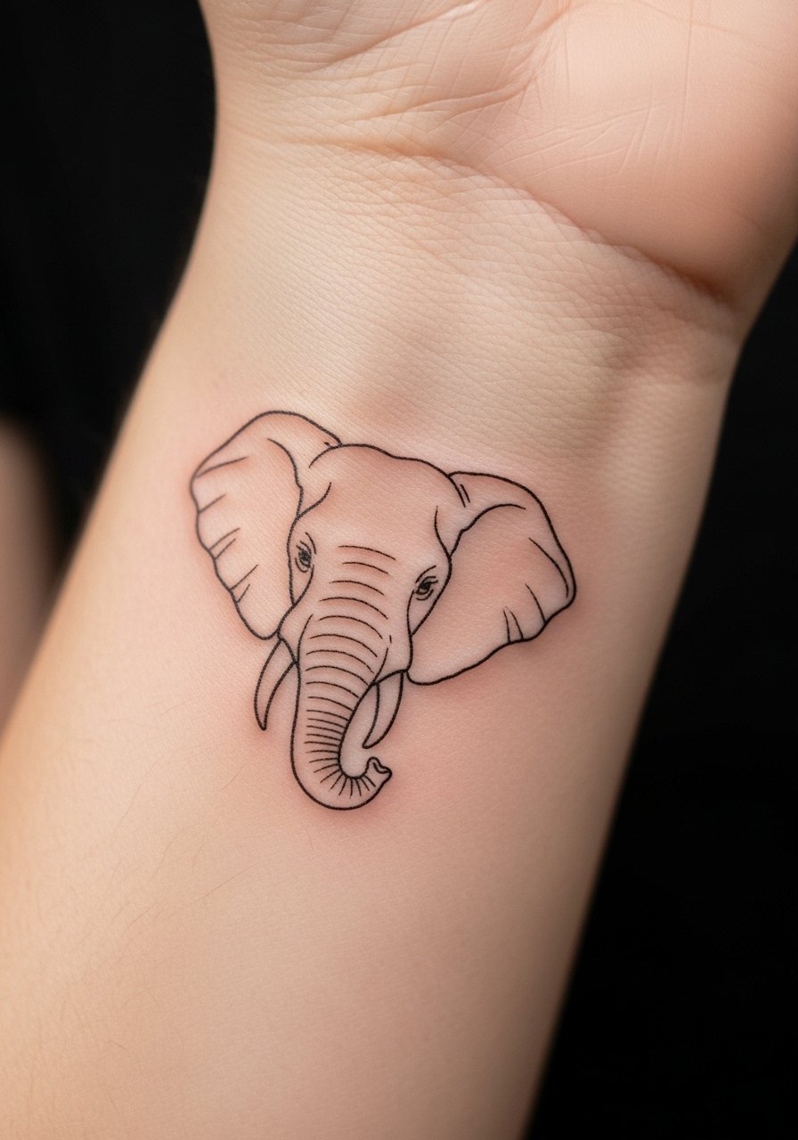 I love this as a first elephant tattoo—an elephant head outline says patience and wisdom without shouting. Visually it reads clean: one or two fine lines for the trunk and ear, maybe a tiny eye. The wrist lets the trunk follow natural wrist curves, which helps flow. Pain is low here, but remember the wrist can sting if your veins are shallow. Healing is quick—surface heals in 2-3 weeks—but fine lines blur faster if the artist doesn’t space lines correctly. From what I’ve seen, you should ask for a slightly bolder fine-line approach if you want longevity. Avoid tiny, crammed details; the common mistake is making it too small for the linework. Look for artists known for small elephant tattoo designs and fine-line portraits on Instagram or Pinterest.