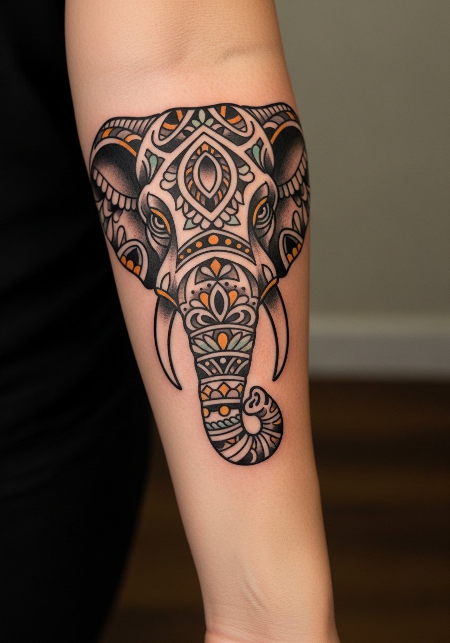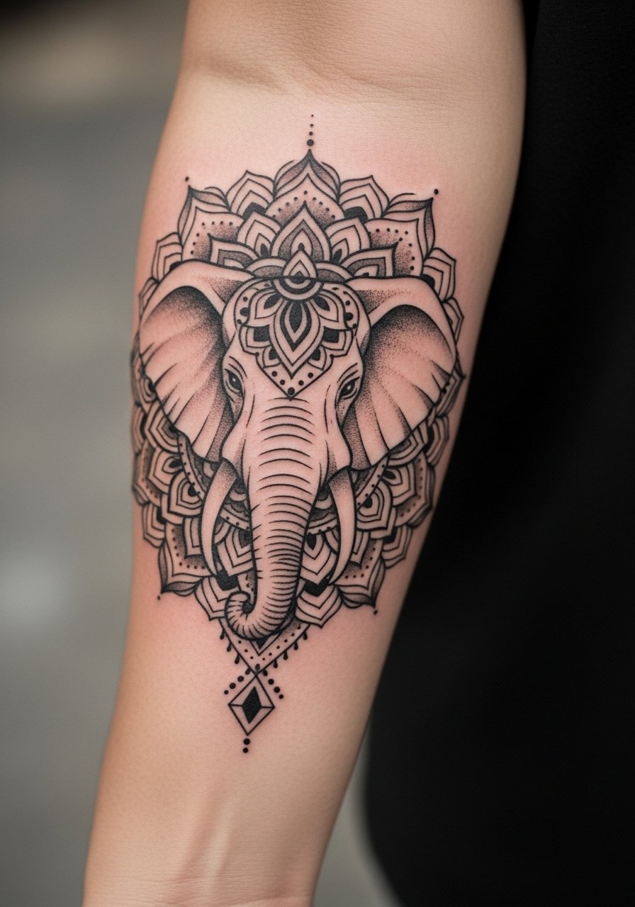Best For: Forearm statement, spiritual symbolism, mandala elephant tattoo