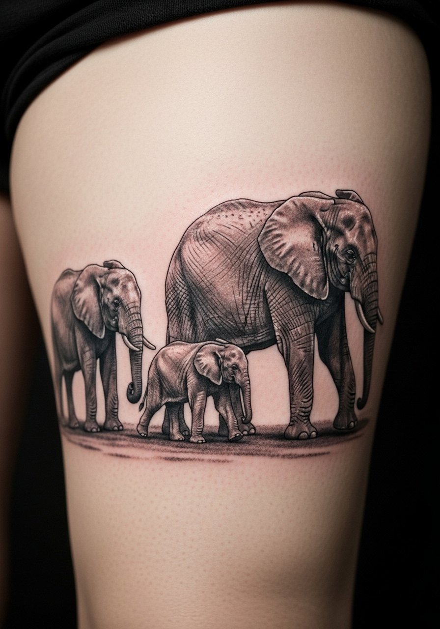 A family group—adult with calves—reads like loyalty and protection. The thigh gives the space for multiple figures and shading, so you can get realistic detail without crowding. Pain on the outer thigh is mild; inner thigh is more sensitive. I like black & gray realism for this because it’s timeless and ages well. Healing is straightforward but expect deeper shading to take a month to settle. One pain point people have is matching styles for couples or parent-child pieces; talk to your artist about consistency if you want matching placements or scaled versions. Don’t compress too many tiny elephants into a narrow area—common mistake. Look for artists who post healed realistic elephant groups on Instagram and Pinterest to vet how shading retains detail.