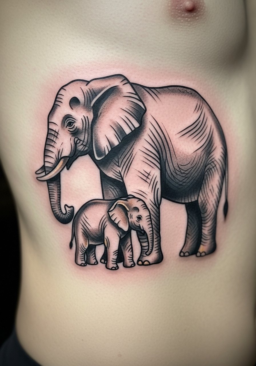 4. Neo-Traditional Elephant With Calf on Ribcage