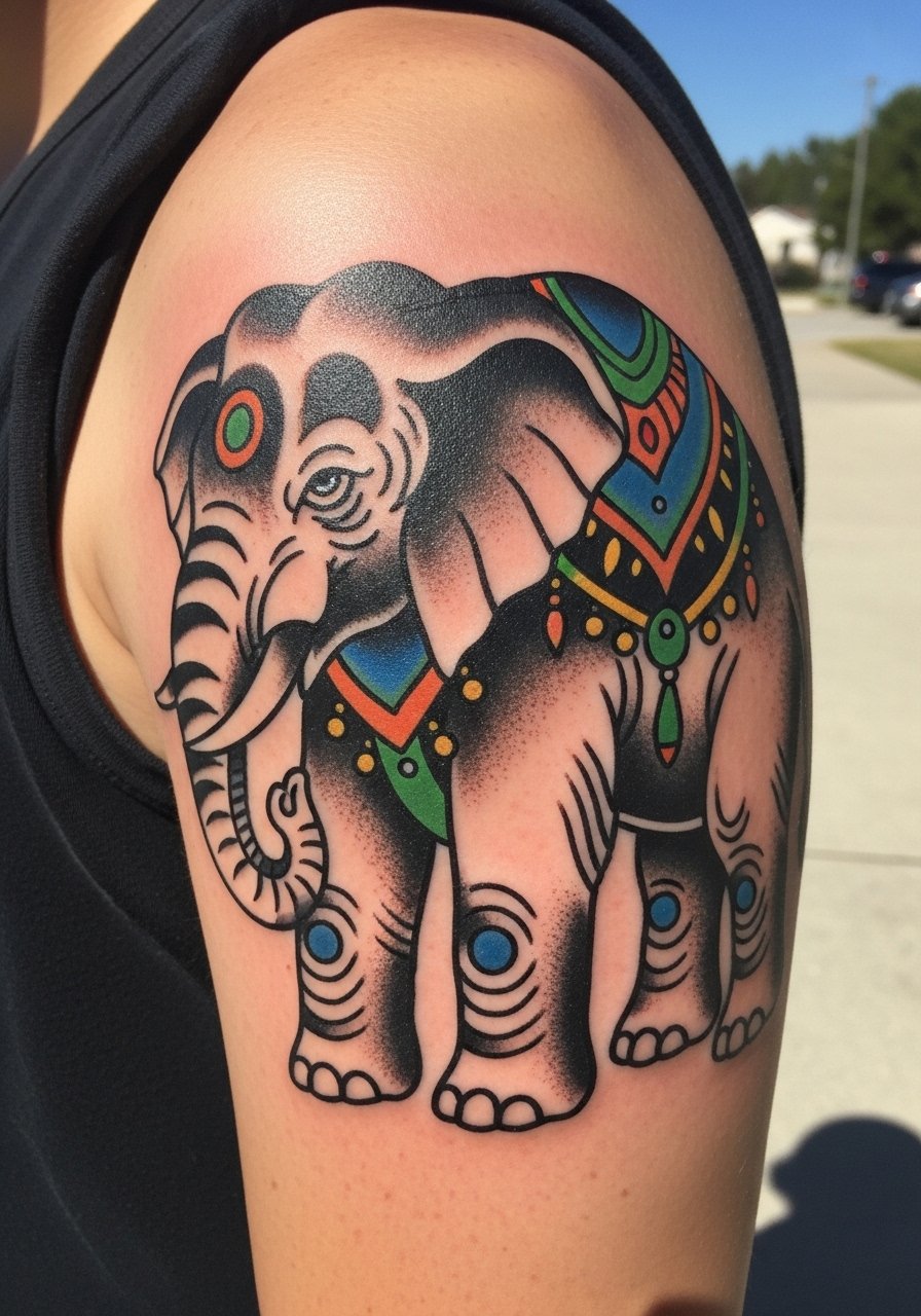 Traditional elephant tattoos bring bold outlines and saturated blocks of color—classic and aging-friendly. On the upper arm you get a forgiving canvas where color and line keep their integrity. Pain is low, and the style looks equally good fresh and healed; you’ll notice mild softening of edges over years but the silhouette reads strong. A frequent misstep is too many small color gradients; stick to flat fills for longevity. I usually look up traditional artists on Instagram to confirm they have healed examples on similar placements. This style is also a solid pick if you worry about future touch-ups—traditional holds up and is easy to refresh.