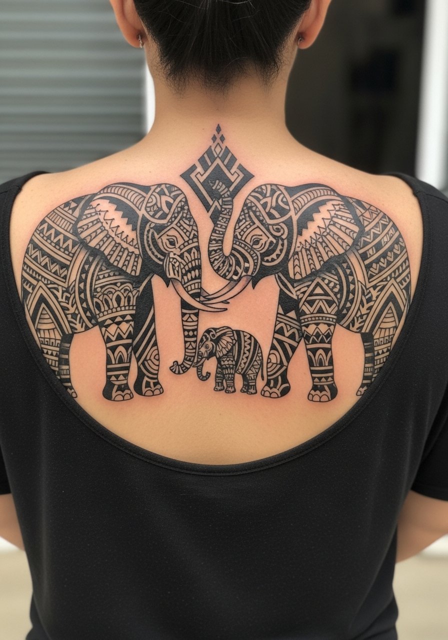 Tribal elephant family layouts use bold geometry and repeating motifs to represent lineage and heritage. The upper back offers a large horizontal space for a row or a sweeping scene. Pain on the back varies—spine areas are tender, but the lateral back is moderate. Tribal blackwork holds well over time; it’s high-contrast and ages slowly. Make sure your design respects cultural roots—talk to artists who specialize in tribal elephant tattoo work. The common mistake I’ve seen is copying generic tribal patterns without adapting them to body flow; ask your artist for horizontal/vertical layout options to suit your back’s curve. This is one of the under-covered ideas that works especially well for family meanings.