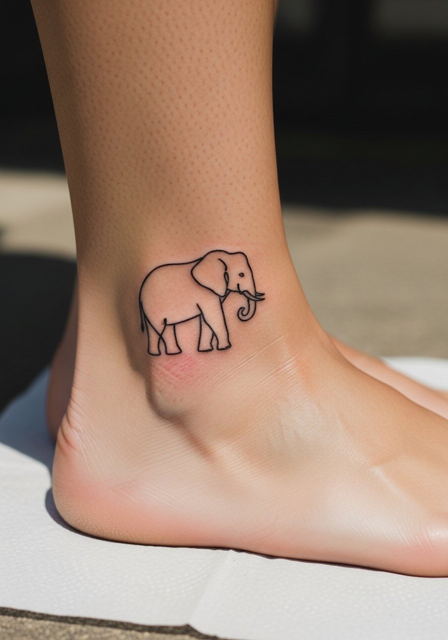 Minimalist ankle outlines are tiny and meaningful—great if you want small elephant tattoos that hint at luck and wisdom. The ankle can hurt more than the wrist due to thin skin and bone proximity, so expect higher pain for a tiny design. Healing is quick but you must avoid rubbing with shoes and socks. I’ve seen many people get one too small; make sure the line width is sufficient or it’ll blur. Ask for a micro-line specialist and ask to see healed ankle examples. This is a classic first-elephant-tattoo option if you want a subtle symbol that you can hide or show easily.