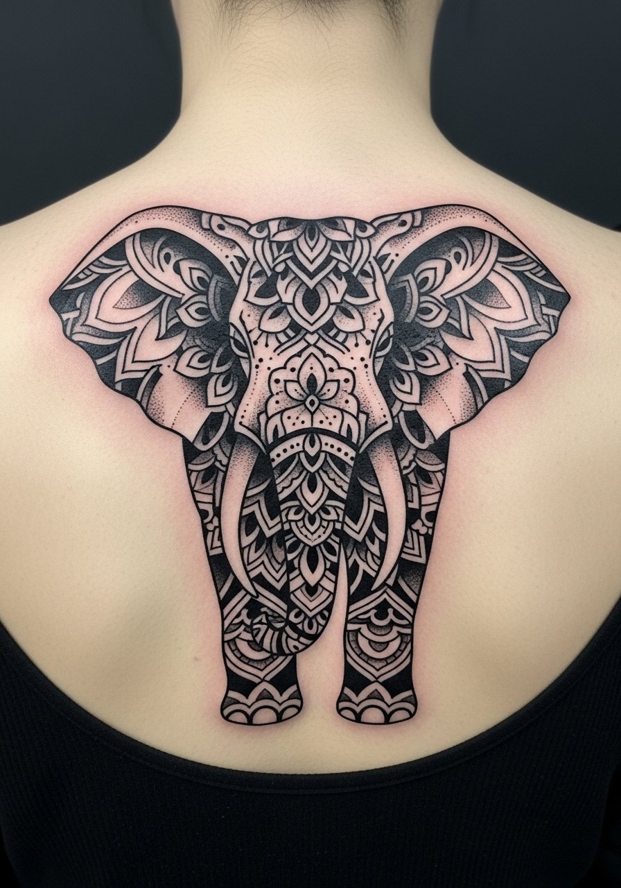 Best For: Large statement, protective symbolism, blackwork mandala elephant