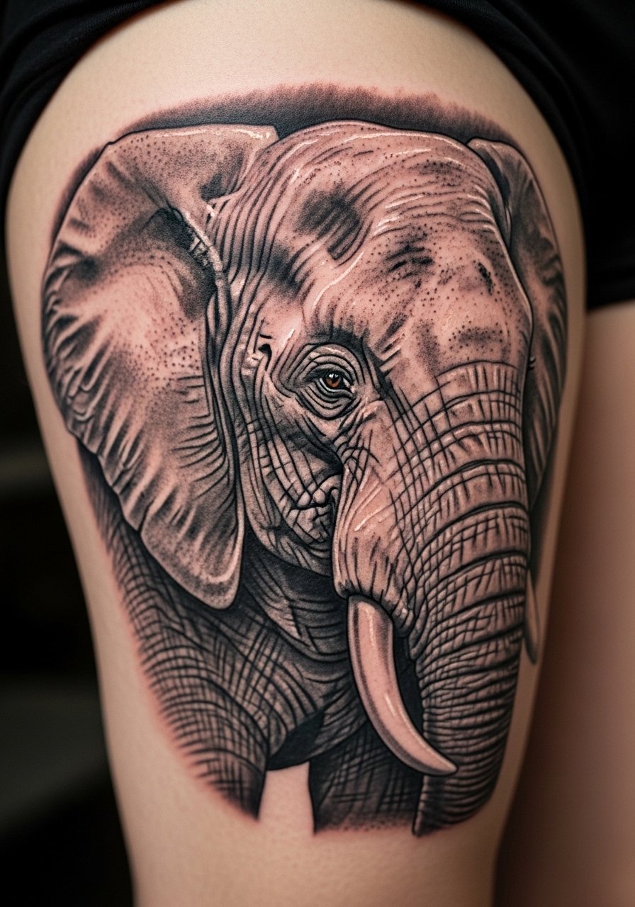 A realistic portrait captures the elephant’s soul—especially the eye. The thigh gives space for deep shading and texture, and pain is generally low. Healed realism can be stunning, but it depends on the artist’s ability to render texture and keep soft shading intact. I’ve seen portraits lose detail if the artist over-blends; request contrast anchors to retain depth. This style is perfect if you want a memorial or deeply personal piece—bring clear reference photos and ask to see healed realism thumbnails in the artist’s portfolio.