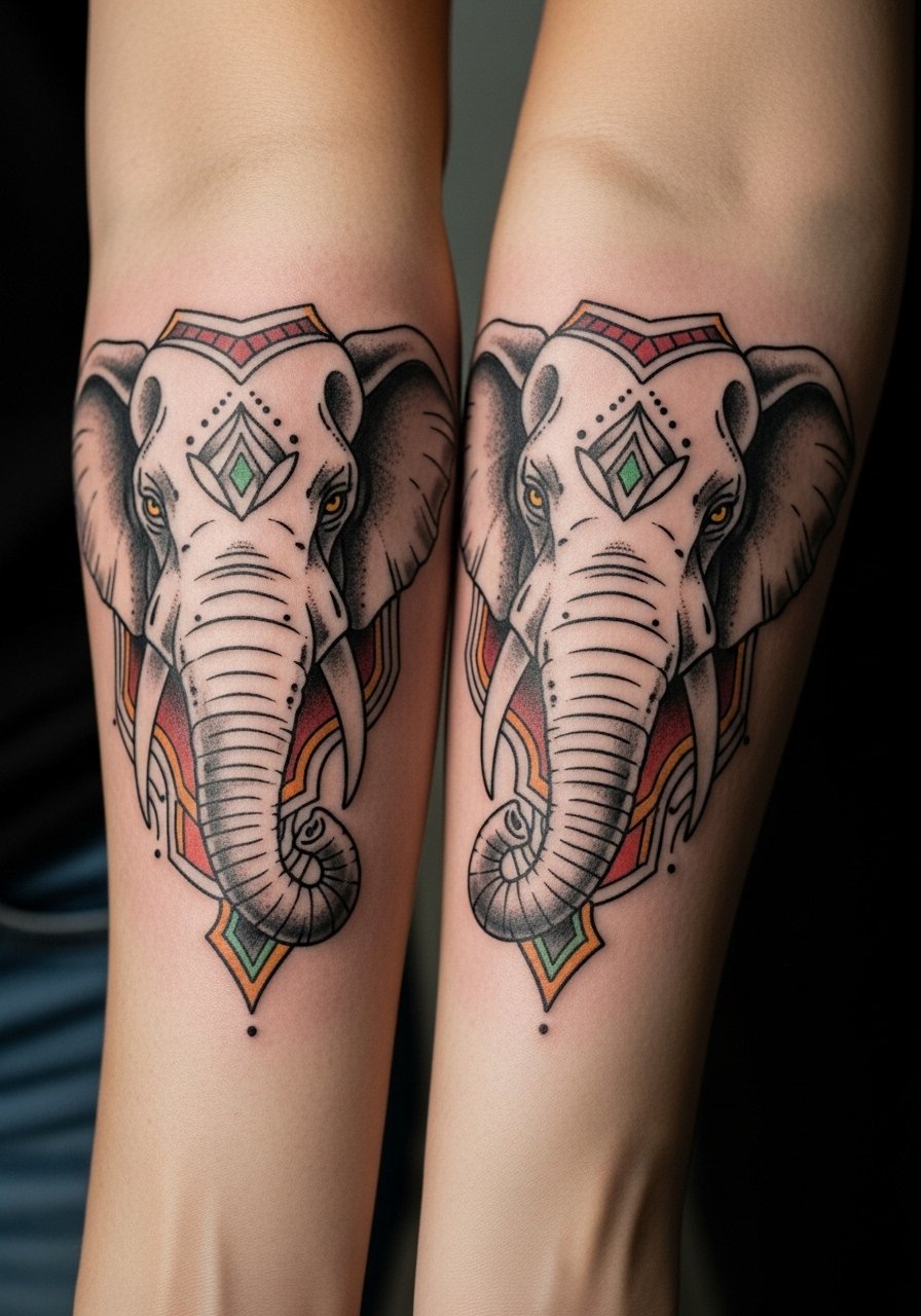 Neo-traditional elephant heads combine the classic silhouette with updated shading and ornamentation—great for couples or fidelity symbolism. The forearm shows off facial detail and ornamental elements like jewelry or floral borders. Pain is bearable; the forearm is a common first-tattoo spot. These age well if the artist uses bold outlines and moderate color saturation. I’ve seen people over-detail the ears; keep enough negative space so features read later. Ask to see healed forearm neo-traditional elephant pieces on artists’ pages. This style also helps with placement regret—forearm work is easy to show or hide with sleeves.
