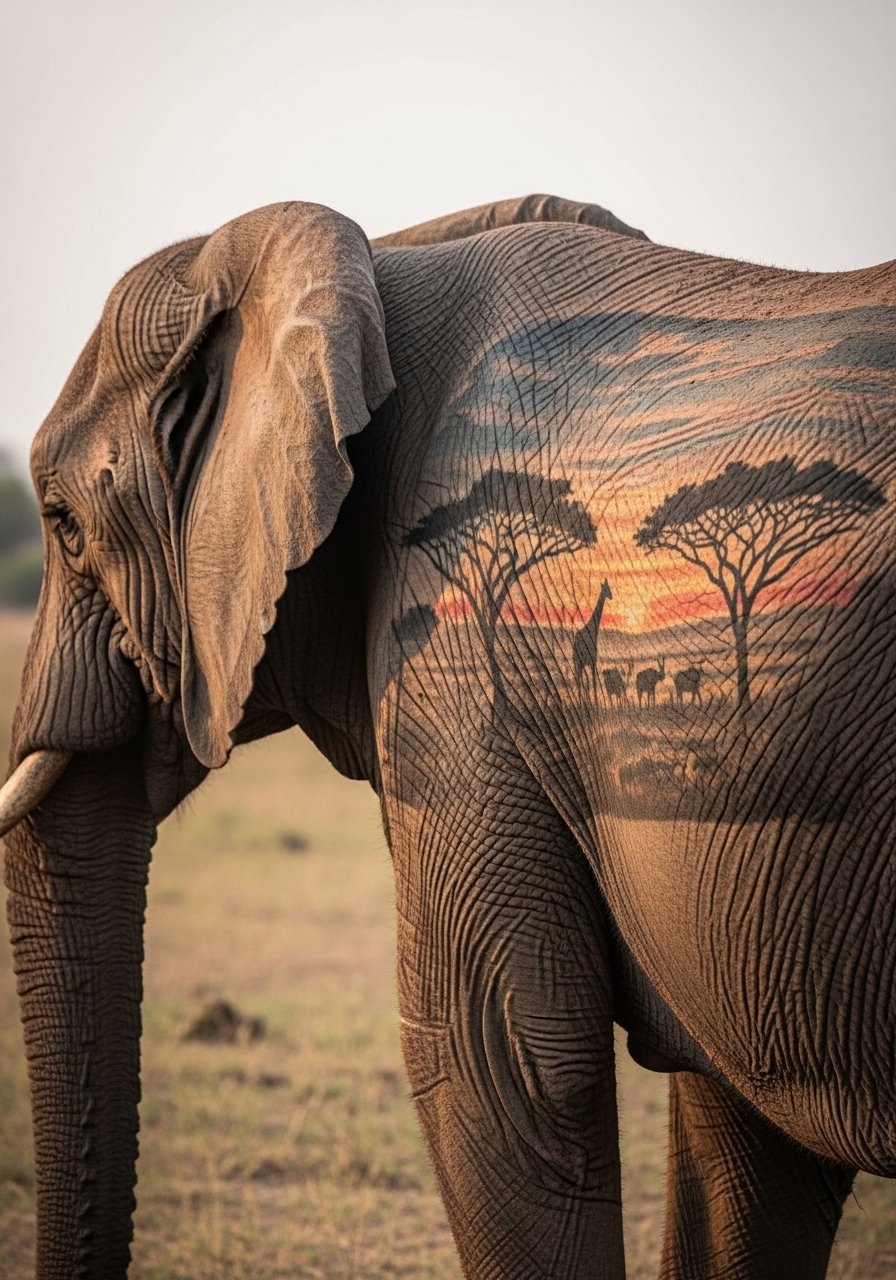 Adding a landscape behind an elephant turns the tattoo into a scene—great if you want storytelling in your elephant tattoo designs. The upper back provides a wide canvas for horizon lines and distant trees; place the elephant so the trunk follows shoulder flow. Pain is moderate and varies near the spine. Big-picture pieces age well if the linework is bold and backgrounds aren’t overly detailed at small scales. A mistake I often see is cramming too much tiny scenery; keep distant elements simplified. I used landscape references from Pinterest to decide on the mood for mine before briefing my artist.