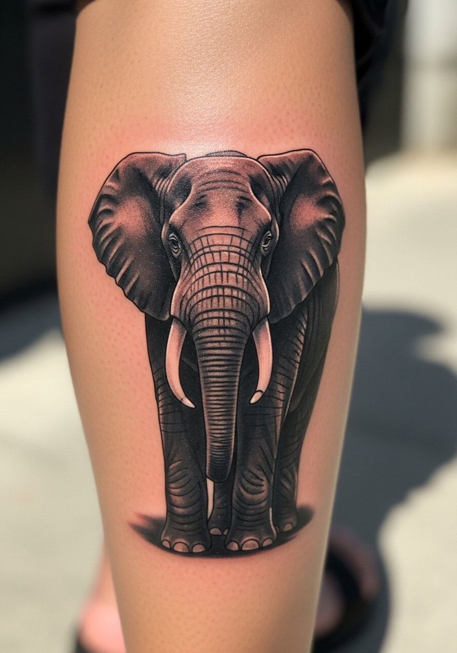 A darker, almost black-swan conceptual elephant can symbolize radical change or uniqueness. The calf is a great vertical canvas for dramatic silhouettes and shading. Pain is moderate and generally tolerable. Because this is conceptual, ask your artist how highlights will age—too many tiny highlights can disappear. This is one of the less-covered angles but powerful for people who identify with change or rarity. I suggest reviewing other dark-concept tattoos from the artist to see their healed highlight work.