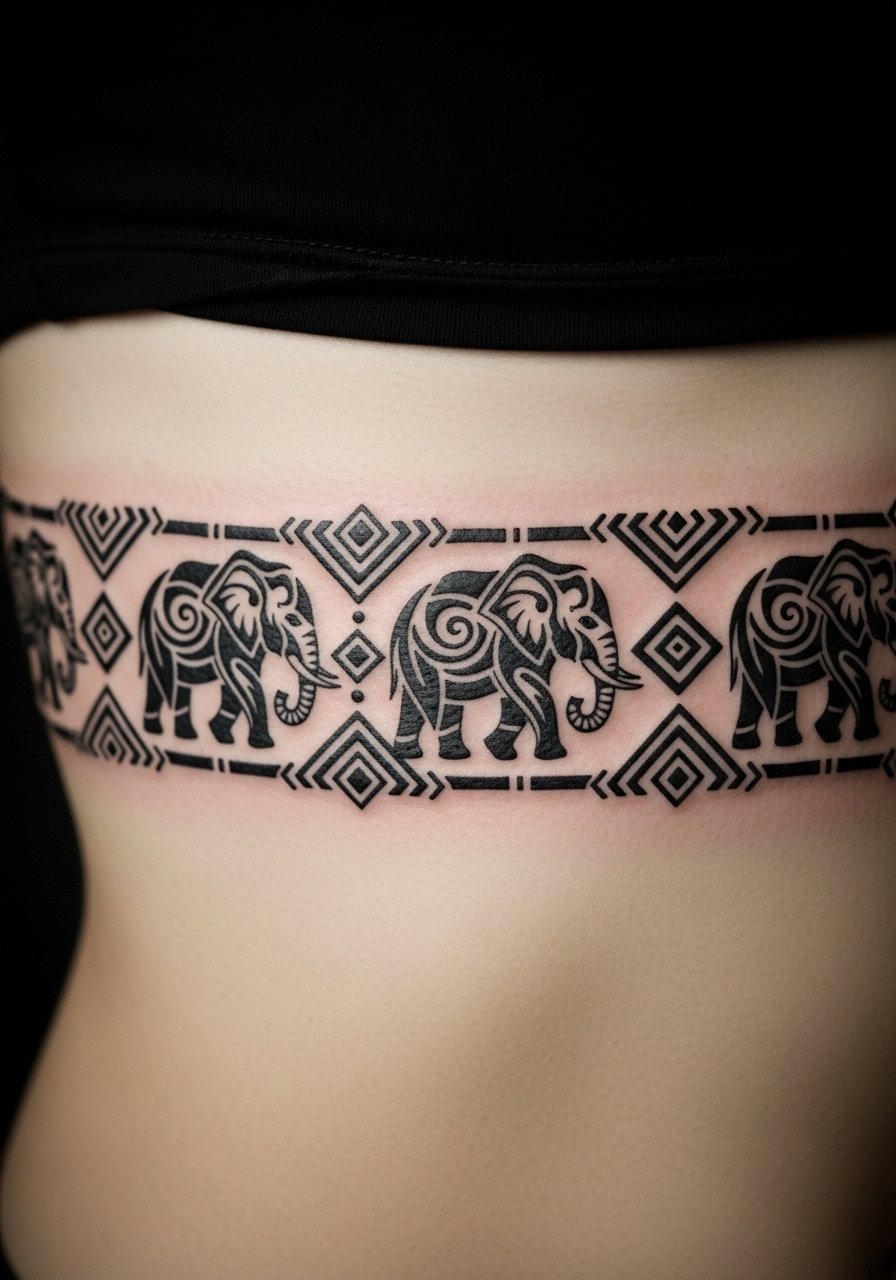A horizontal tribal row across the ribs or flank suits multiple elephants in sequence and reads as family lineage. Expect high pain across ribs—plan for breathing and breaks. The linear layout needs spacing so each elephant keeps character as the skin moves. I see people make them too tight, and later the forms merge; leave negative space. If you want matching family tattoos across partners, align the row to body flow in a consult. This idea addresses the gap in many galleries that neglect horizontal/vertical layout options for multi-elephant designs.