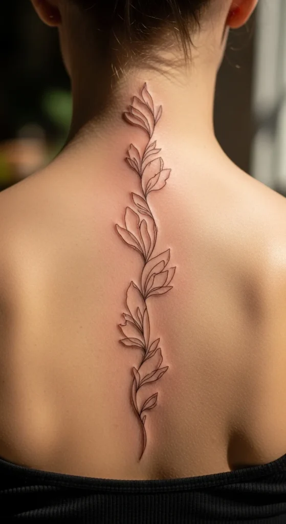 An abstract floral line down the spine creates a flowing vertical story without feeling crowded. This trend is growing fast for 2026 as more people choose freehand shapes instead of strict realism. Before booking, ask your artist for a simple pencil sketch that follows your spine’s natural curve. Tape the sketch to your back and take photos to see where the line should start and end. If you want to keep costs down, stick to a single continuous line with small curves suggesting petals. You don’t need detailed blooms for it to look expressive. These designs age well because they rely on movement rather than tiny details. Wear loose clothing for a few days after your session. If you want a symbolic touch, ask for three curved segments to represent past, present, and future. Keep spacing generous to help the design stay clear.