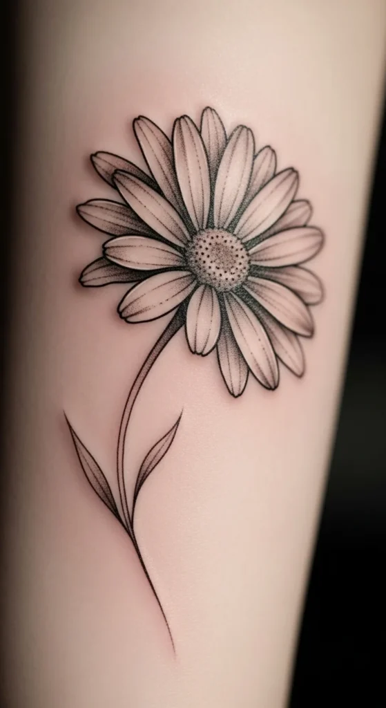 A botanical daisy suits anyone who loves scientific-style art. The daisy shape holds detail without looking overwhelming. Choose the inner arm or calf for this design since the surface stays flatter for fine lines. To plan your piece, print a botanical reference and trace it using a fine pencil. This helps you understand how the petals stack. If you’re watching your budget, simplify the center by using dot shading instead of dense texture. These designs look clear when placed vertically with the stem running down. To personalize, you can add a Latin name below it in tiny script. Keep aftercare simple—just clean, moisturize, and avoid pulling clothing. Botanical designs age nicely when spaced well, so leave extra room around the petals.