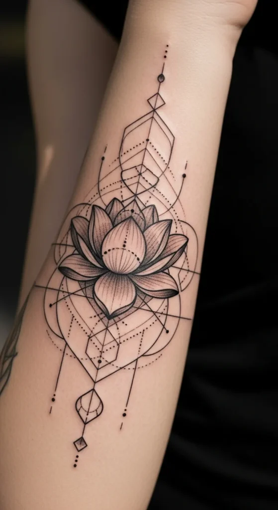 A lotus paired with geometric shapes gives a clean, modern feel. The petals contrast nicely with sharp lines. Forearms work best because the straight forms sit well on flat surfaces. To try the design at home, draw a lotus and overlay it with simple shapes like triangles or thin arcs. You can test combinations by printing them on transparent sheets and layering them. For a budget-friendly option, keep the shapes minimal and avoid solid black fills. Thin lines age better and cost less time. If you want meaning, assign each shape a purpose—such as a triangle for direction. Keep everything balanced so the lotus stays the focal point. This design works in black ink but also pairs well with soft shading if your artist specializes in clean geometry.