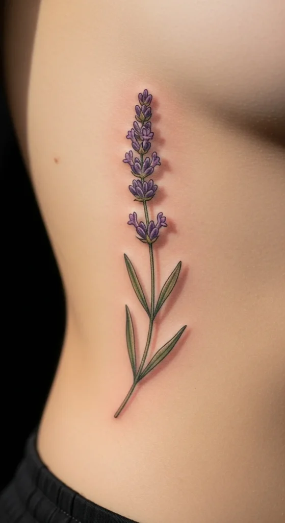 A lavender stem feels calming and elegant. The ribcage suits long, slender designs and allows the flower to stretch naturally. Before committing, draw a thin lavender sprig on a strip of paper and tape it along your side. Move and bend slightly to see how it shifts. Lavender looks lovely in both black ink and soft purple, though purple may fade faster. If you’re hoping to save money, go with outlines only. The rib area can feel tender during the session, so keep the design simple to limit time. Moisturize the skin well before your appointment for smoother lines. Wear loose, soft tops for a few days. A long single stem gives a peaceful look without taking over your torso.