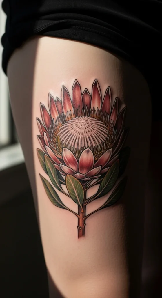 Protea flowers bring a sense of strength and individuality. A thigh placement gives enough space for the textured petals without feeling crowded. To plan the size, sketch a rough shape on paper and hold it against your thigh while sitting and standing—this helps you see how the bloom shifts with movement. Proteas look great in black and grey because the layered petals naturally create depth. If you want to save time, ask your artist to focus on outer petals and simplify the center. This area heals well due to soft skin and limited friction. Add a single leaf if you want a longer shape without adding much detail. A protea stands out even alone, making it a strong centerpiece tattoo.