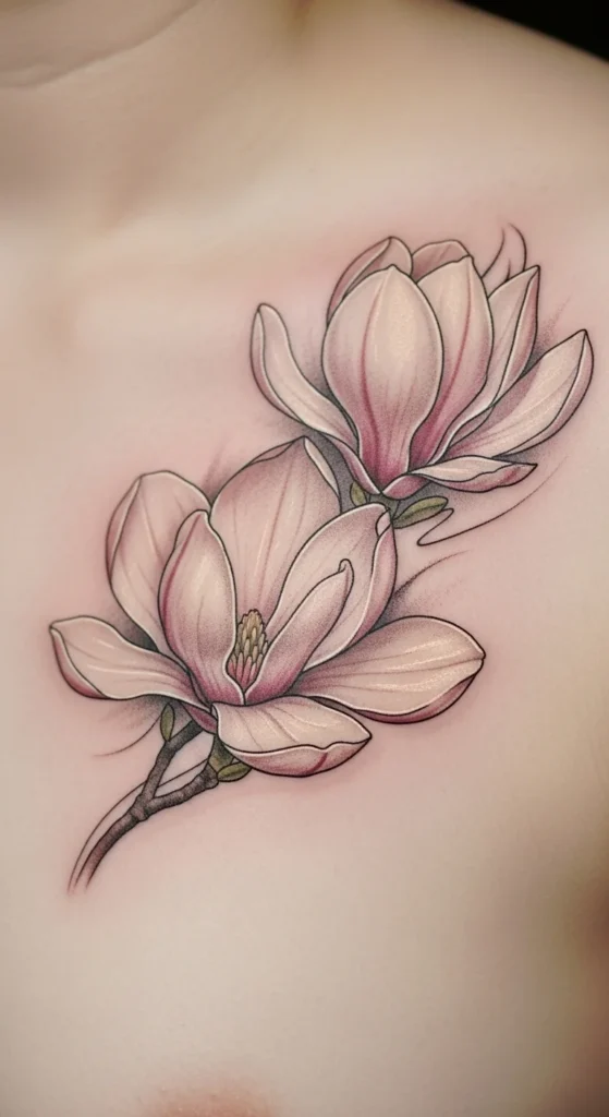 Magnolias carry a gentle sense of inner calm and clarity. Placing one over the heart area adds quiet symbolism. Use a small sketch cutout to test how far you want it toward the center. Many people choose a single bloom for simplicity. If you’re keeping your budget lower, skip heavy shading and rely on petal outlines. This spot stays covered most of the time, so fading stays minimal. Wear soft fabric for the first few days as the area can feel tender. To personalize it, add a single falling petal to represent change. Magnolias look beautiful in slightly larger sizes because their wide petals need room to breathe. Keep the lines gently spaced for a clear long-term look.