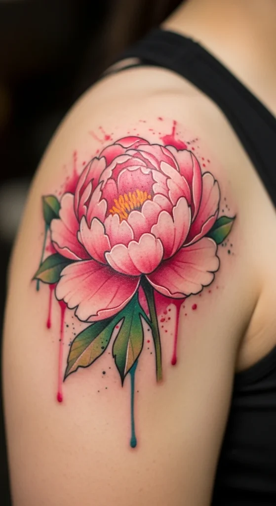 A watercolor peony on the shoulder brings a gentle splash of color without harsh outlines. If you love painterly art, this style gives a soft wash effect that still feels expressive. Shoulder placement also gives the artist more room to create smooth gradients. Before getting it done, test color blends on paper using diluted markers or paint to understand what shades draw your eye. Watercolor pieces look best when the center stays more saturated and the edges fade naturally. If you’re on a budget, choose one flower instead of multiple blooms. Ask your artist for feathered edges instead of many layers—that keeps both time and cost manageable. This spot works well under loose tops, letting the design peek out without feeling overwhelming. Keep sunscreen handy since watercolor pigments fade faster. A photo of your shoulder in natural light can help the artist map the curve and adjust the flow.