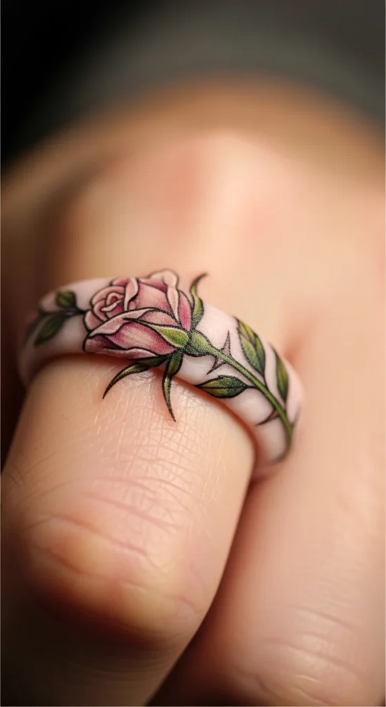 A wild rose ring offers a charming everyday look. Because fingers fade faster, choose a slightly thicker line weight. Try drawing a thin outline on your finger with a fine marker to preview the wrap. Keep the rose small and simple, with just a few petals. This helps it age clearly. If you’re budget-conscious, choose a single bloom with two small leaves. Finger tattoos heal quickly but can flake more, so moisturize gently. Avoid heavy water contact for the first week. A wild rose ring pairs well with minimal jewelry and feels personal without being loud.